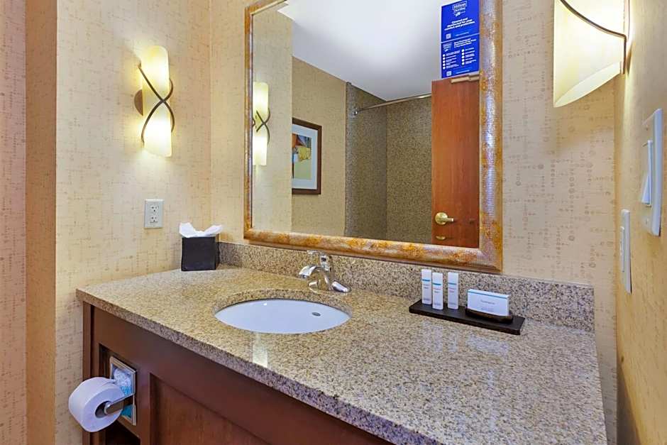 This suite features a microwave, refrigerator, and coffee-making facilities. It is mobility and hearing accessible and includes a roll-in shower.